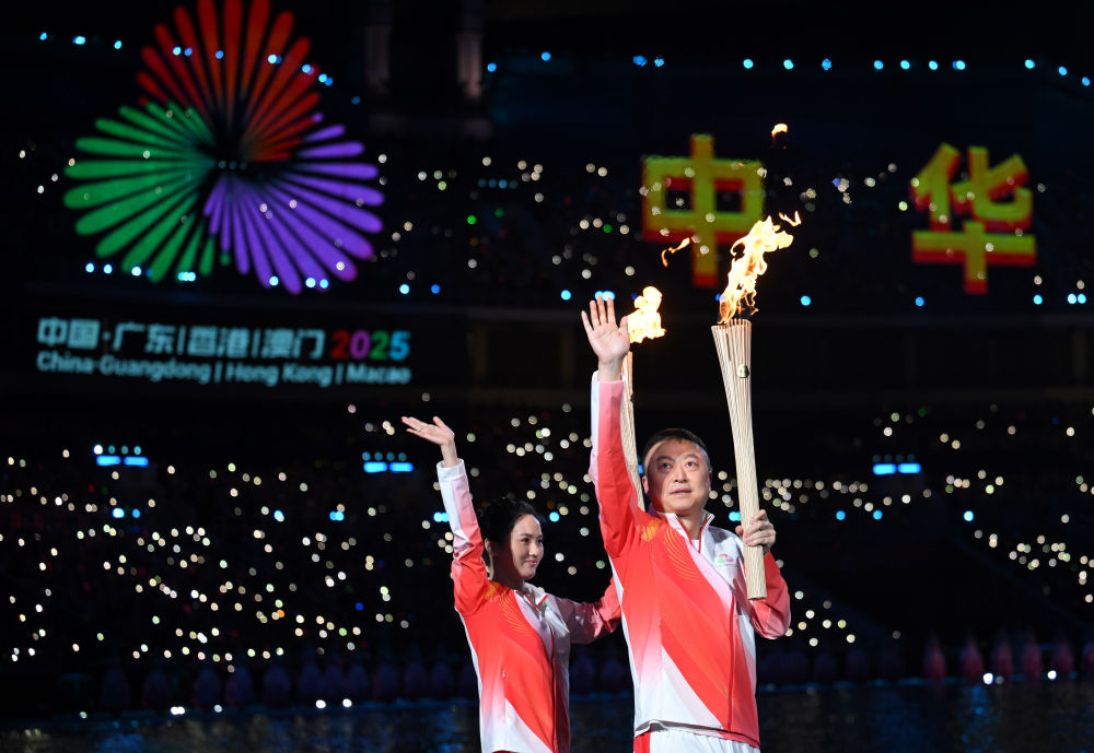 广东省体育代表团、香港特别行政区体育代表团、澳门特别行政区体育代表团在入场仪式上共同入场。新华社记者赖向东摄