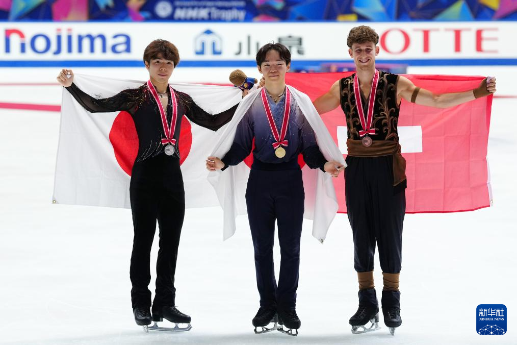 11月8日,获得冠军的日本选手键山优真(中)、获得亚军的日本选手佐藤骏(左) 与获得季军的瑞士选手布里奇吉在男子单人滑颁奖仪式后合影。