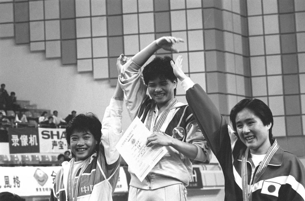 1988年4月4日,在广州举行的第三届亚洲游泳锦标赛女子跳板决赛中,凌海婵以557.76分的总成绩获得冠军。图为凌海婵(中)与亚军中国选手林小妮(左)、第三名日本选手元幸(右)在领奖台上。新华社记者 刘玉生 摄(传真照片)