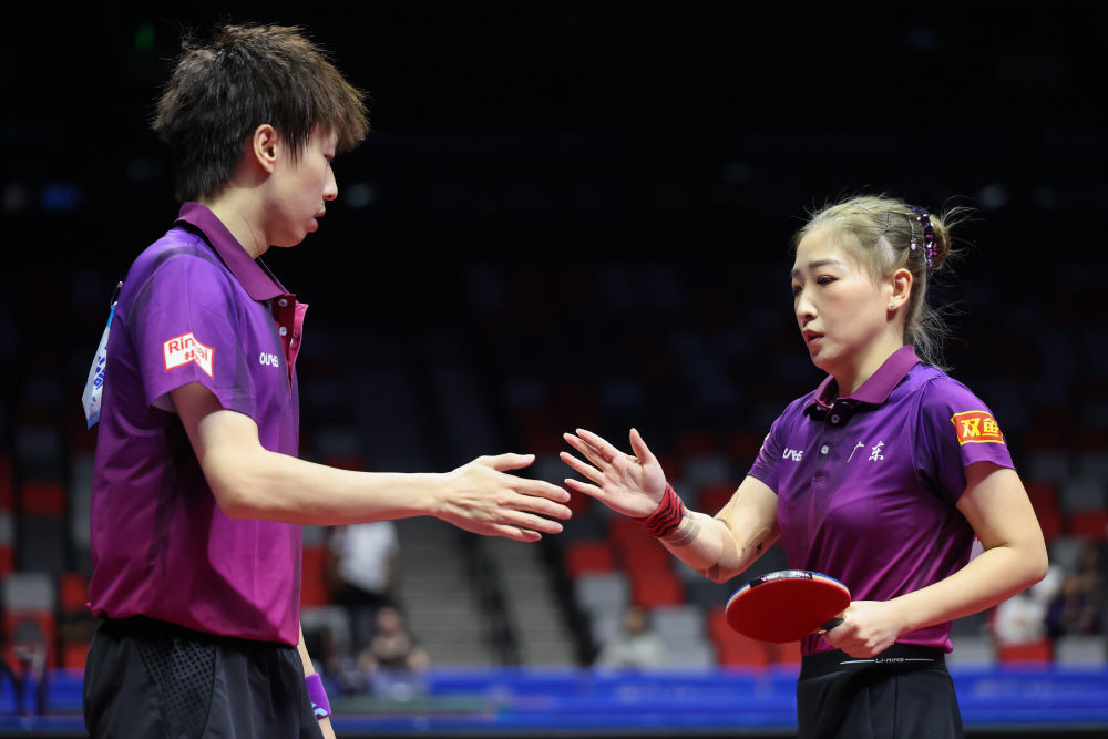 11月10日,广东队组合林高远(左)/刘诗雯在获胜后击掌庆祝。当日,在澳门举行的第十五届全国运动会乒乓球混合双打1/8决赛中,广东队组合林高远/刘诗雯3比0战胜香港队组合姚钧涛/吴咏琳,晋级下一轮。新华社记者 刘续 摄