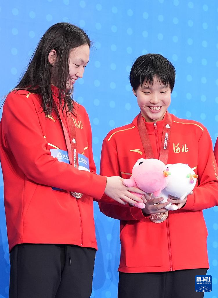 11月10日,季军河北队选手李冰洁(左)和于子迪在颁奖仪式上欣赏吉祥物。