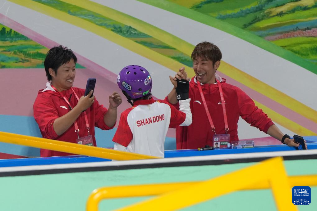 11月11日,山东选手崔宸曦(中)在赛后同教练庆祝。她获得冠军。