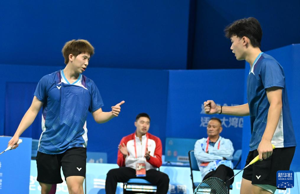 11月10日,安徽队组合刘阳(左)/于奥键在男双比赛中庆祝。他们2比0战胜江西队组合王鹏程/陈俊霖。