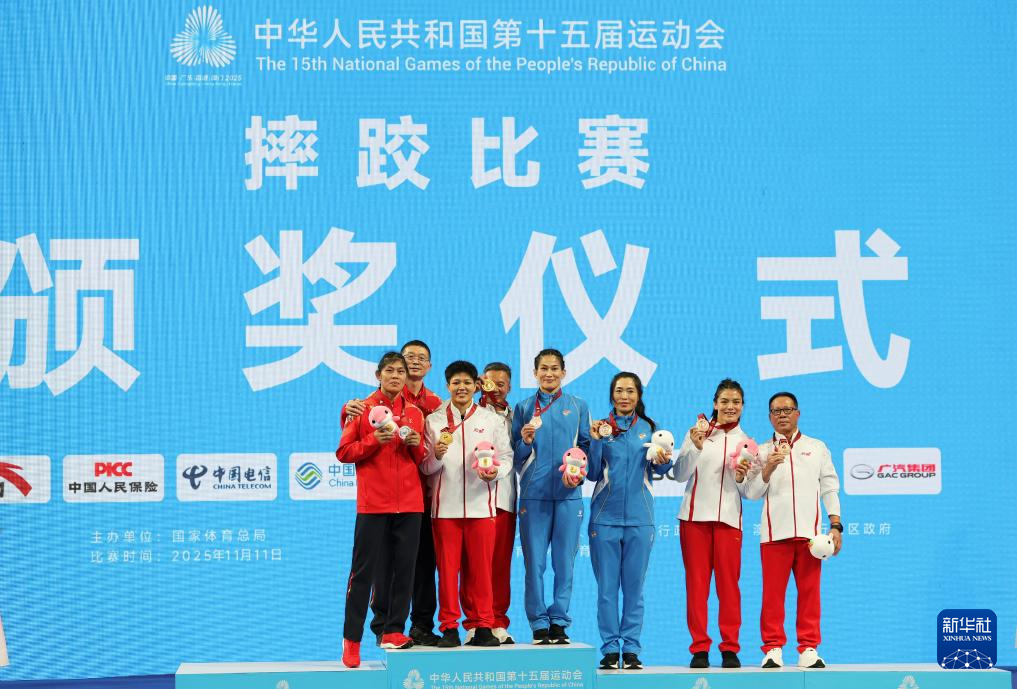 11月11日,冠军云南队选手龙佳(左三)、亚军江苏队选手韩悦(左一)、季军辽宁队选手周凤(右四)、季军云南队选手李泽露(右二)和教练员在颁奖仪式上合影。