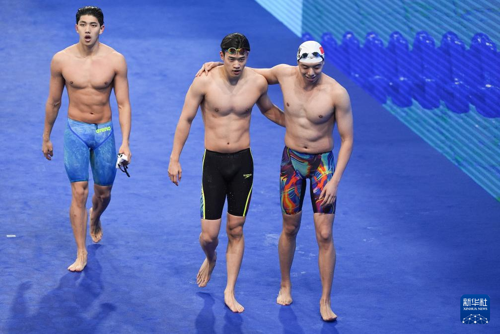 11月12日,中国公安体育协会队选手季新杰(右)与浙江队选手潘展乐(中)在比赛后。他们分别获得亚军、季军。