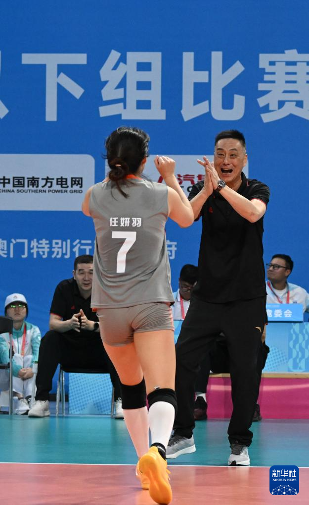 11月13日,河北队教练张忠伟(右)和队员任妍羽庆祝得分。