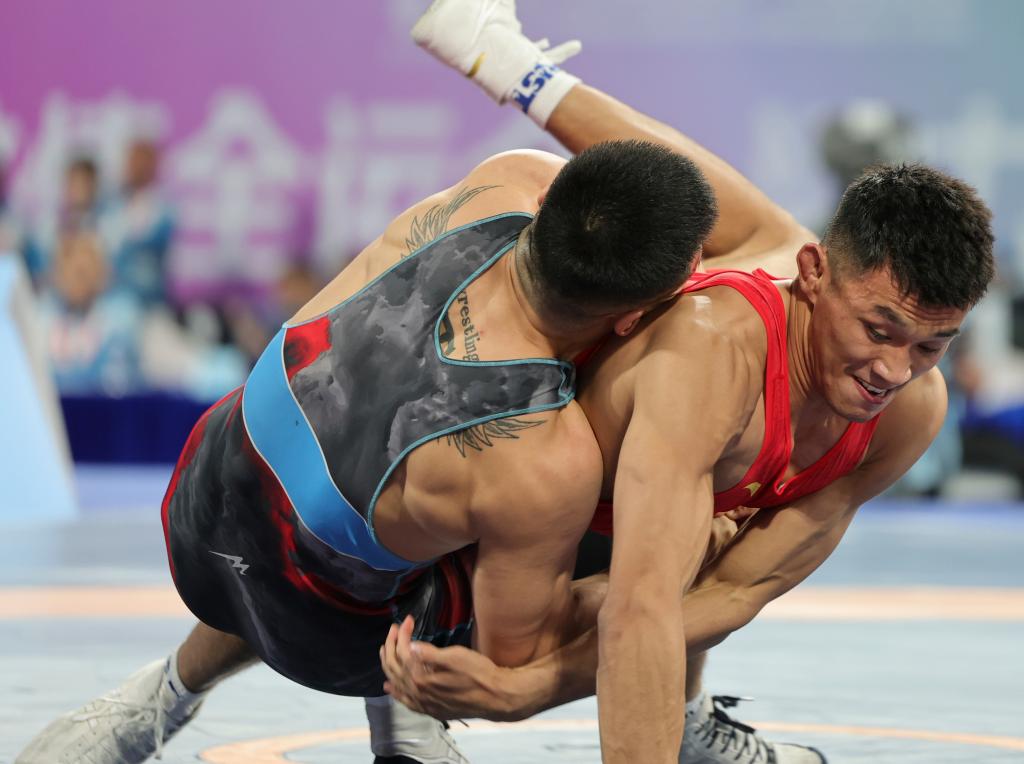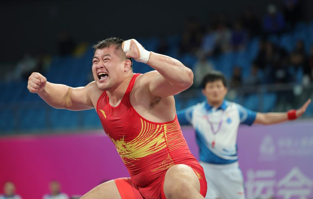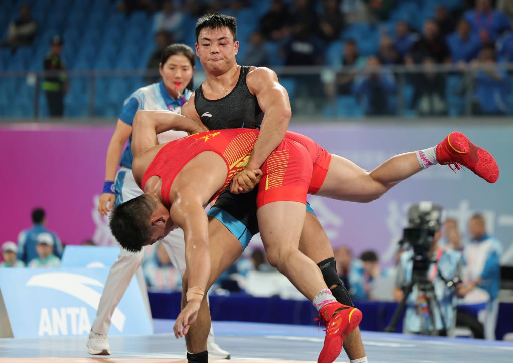 男子古典式摔跤77公斤级决赛,赛会一号种子、山东队刘瑞与二号种子新疆队巴合江·哈力山上演巅峰对决。开场仅12秒,刘瑞在一次进攻中手指不慎脱臼,经过医疗处理后,这位上届全运会该项目银牌得主展现出极强的韧性,上半场通过跪撑进攻连拿4分。下半场,巴合江进攻更加积极,试图扭转局势,但未能把握住机会,比分定格在4:1,刘瑞夺得冠军。