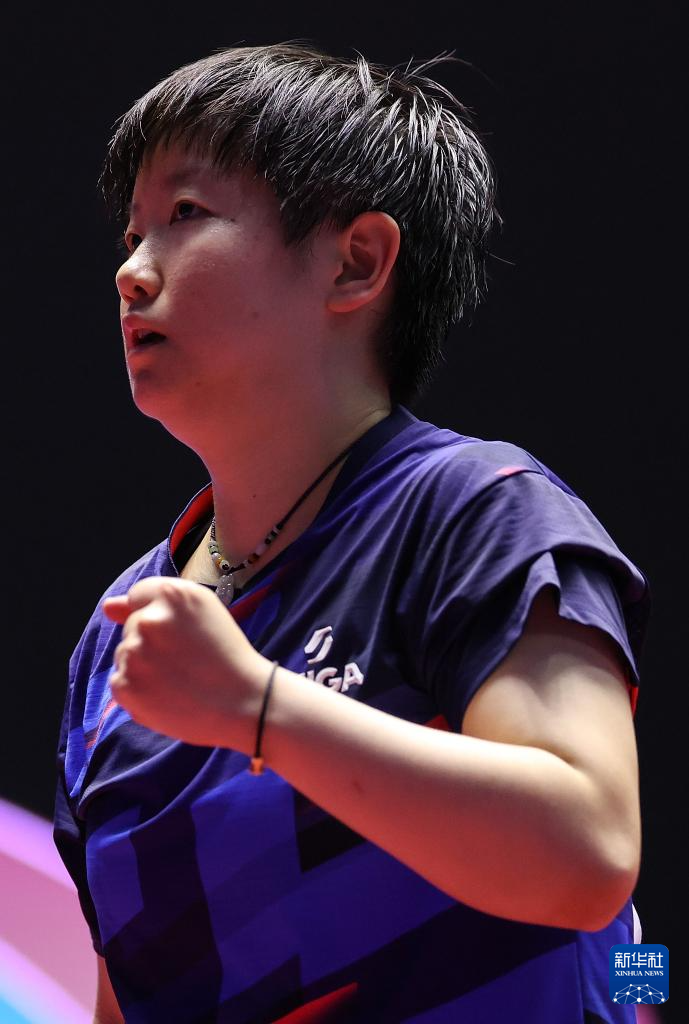 11月13日,河北队选手孙颖莎在比赛中庆祝得分。