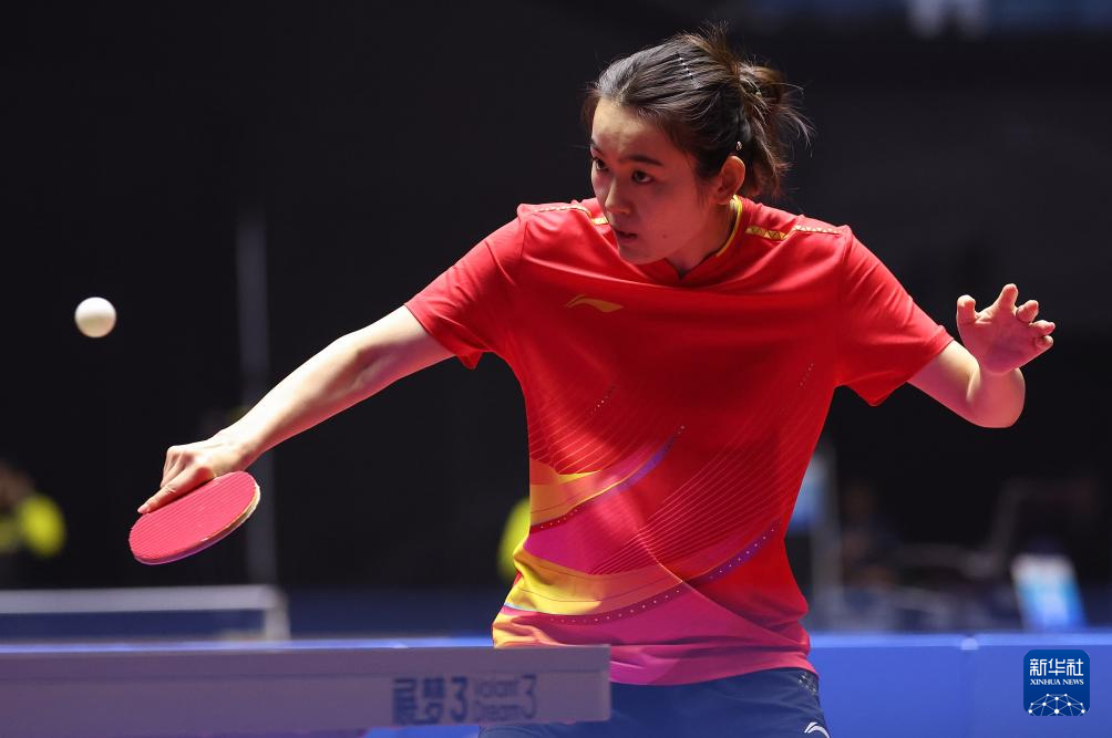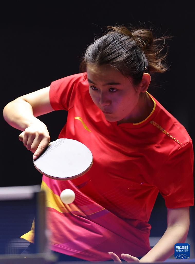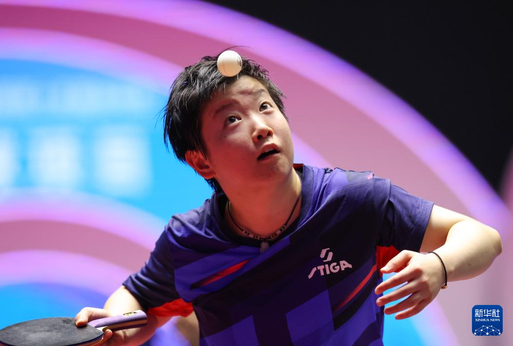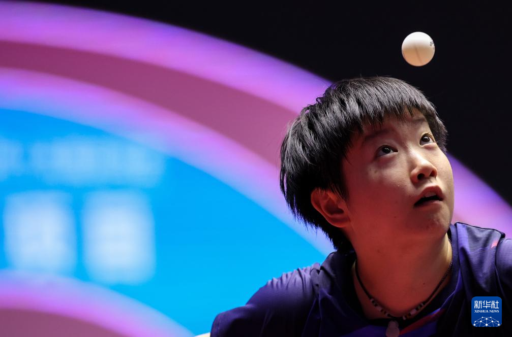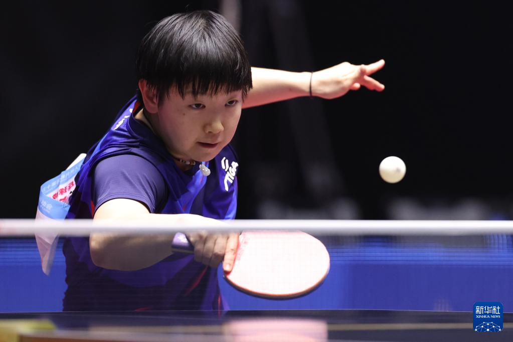 11月13日,河北队选手孙颖莎在比赛中回球。