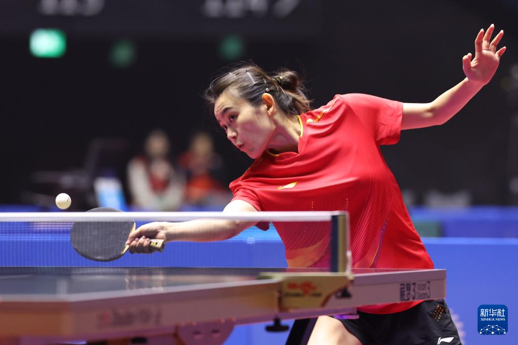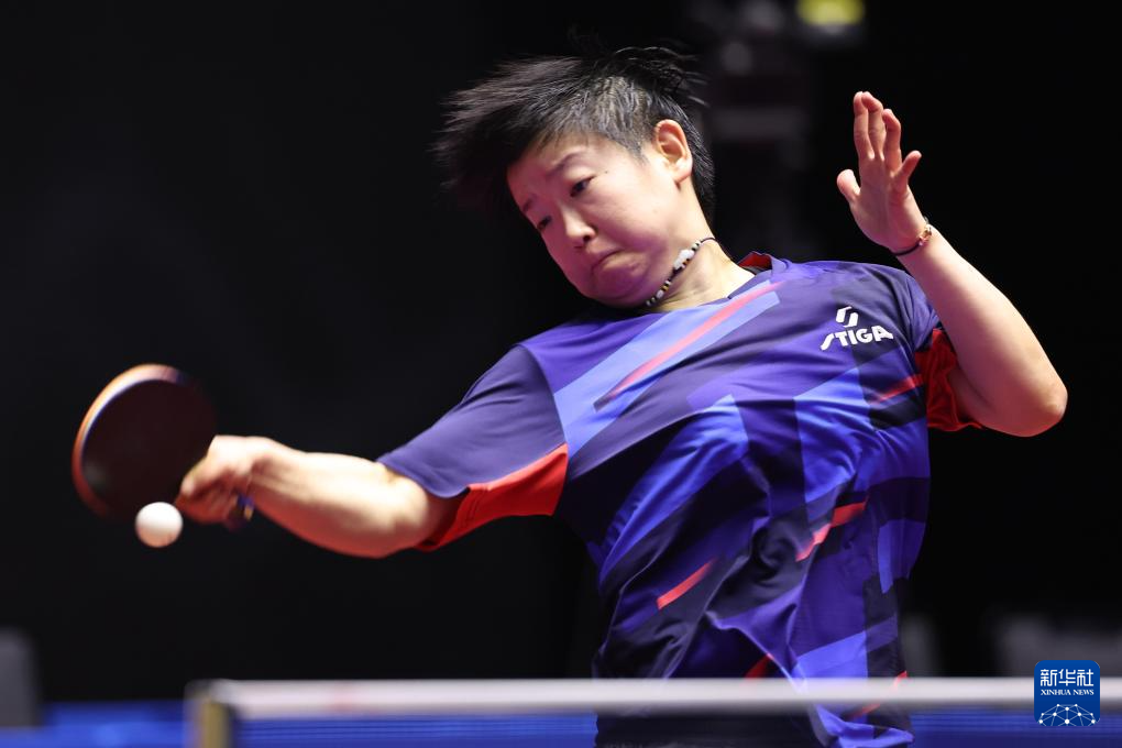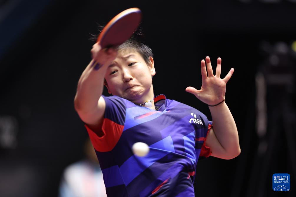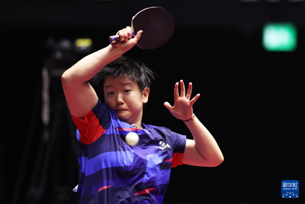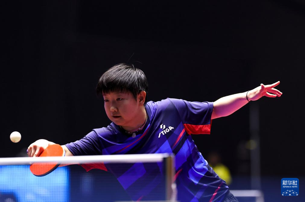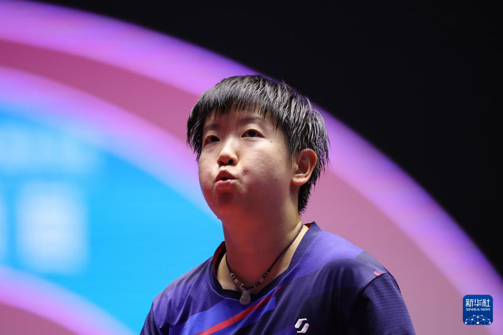 11月13日,河北队选手孙颖莎在比赛中回球。