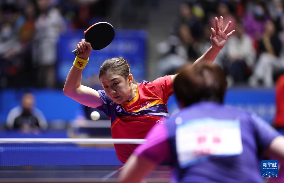 11月13日,山东队选手陈梦(左)在比赛中回球。