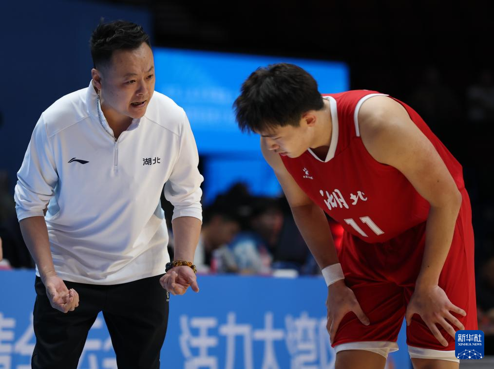 11月13日,湖北队主教练王超(左)在场边指导湖北队球员李子沐。