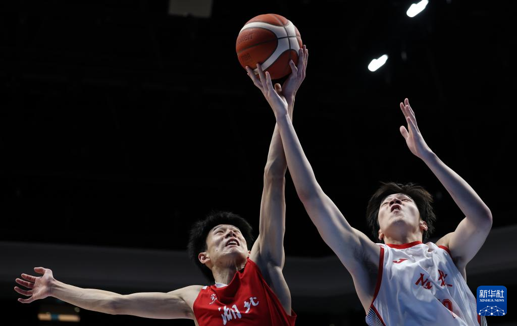 11月13日,湖北队球员李沂泽(左)与吉林队球员李雨轩在比赛中拼抢篮板球。