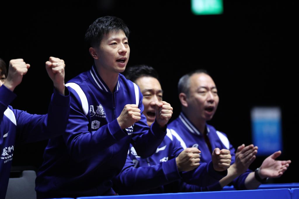 在为北京队拿下首盘胜利后,马龙坐到了教练席。他认真观看了队友王楚钦、黄友政的后两盘比赛。当队友打出好球,马龙总不吝掌声;当黄友政第四局与对手打到10:10后,马龙也紧张地站起了身,直到黄友政17:15拿下比赛。