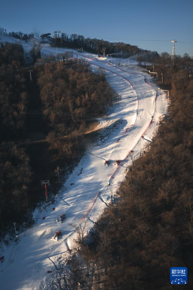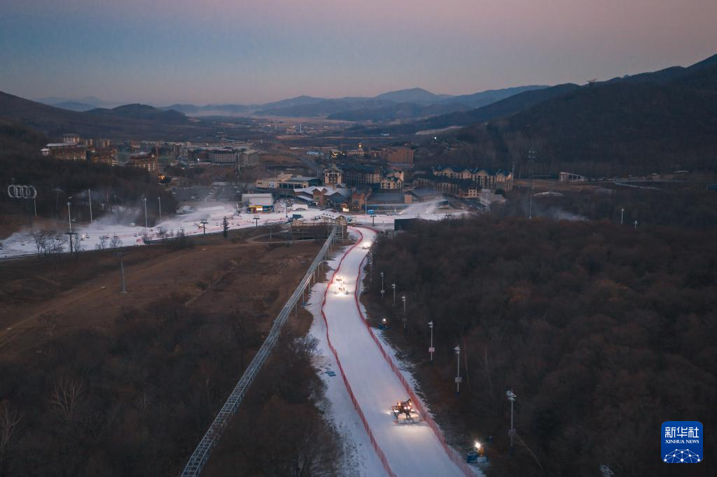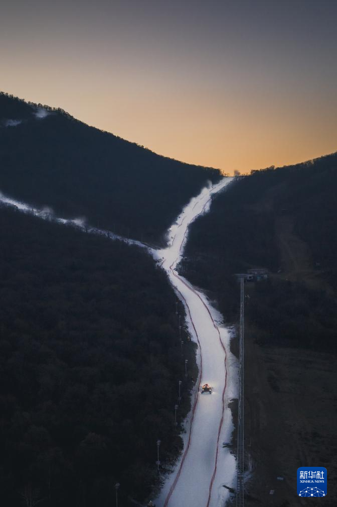11月14日,在位于吉林市冰雪经济高质量发展试验区的北大湖滑雪度假区,压雪机在雪道上作业(无人机照片)。