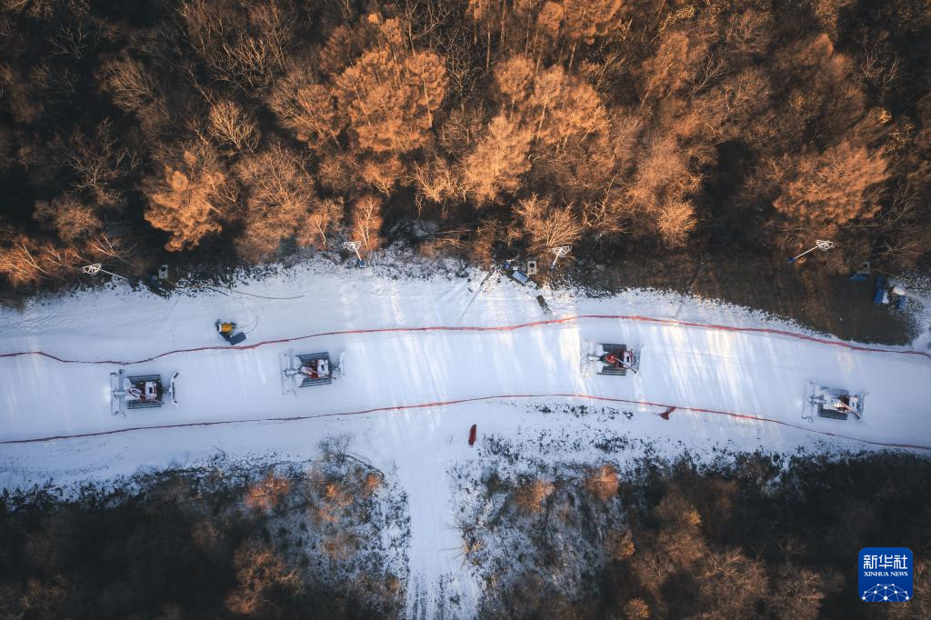 11月13日,位于吉林省吉林市的松花湖度假区雪场在进行造雪工作(无人机照片)。