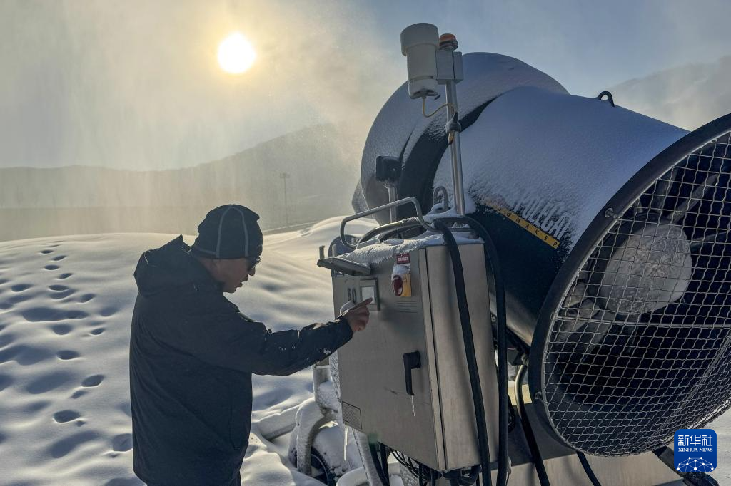 11月14日,在位于吉林省吉林市的松花湖度假区雪场,负责人吴涛检查造雪机工作情况。