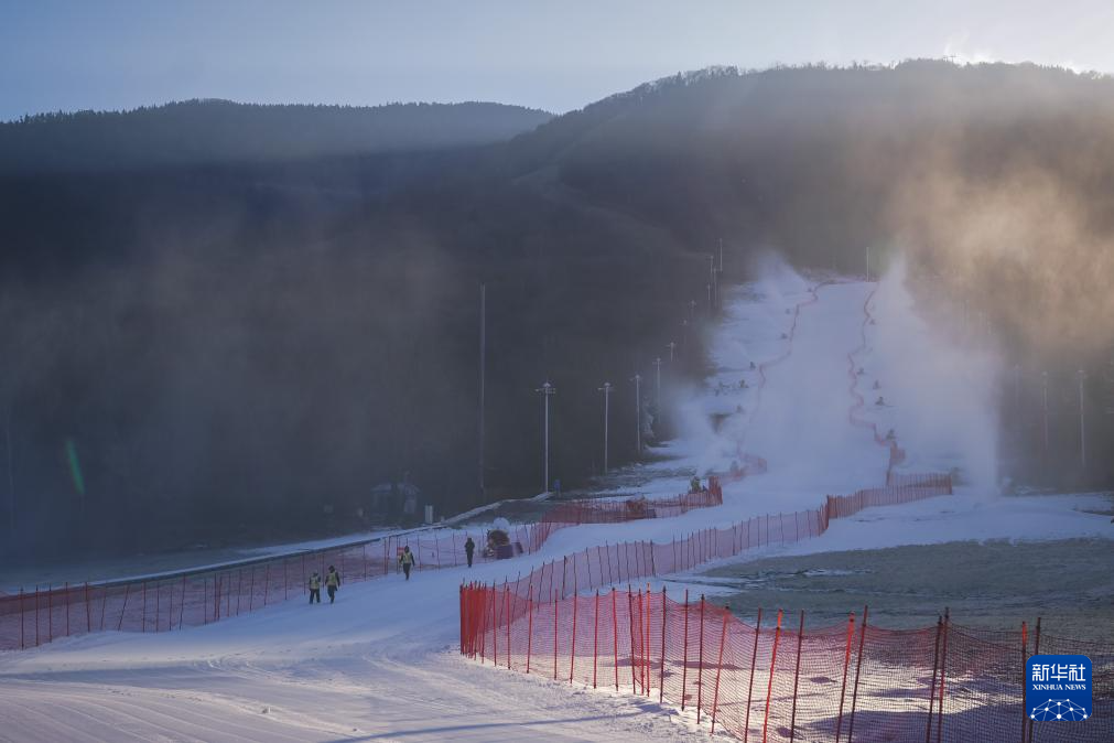 11月14日,在位于吉林市冰雪经济高质量发展试验区的北大湖滑雪度假区,工作人员对雪道上架设的安全护网进行巡检。