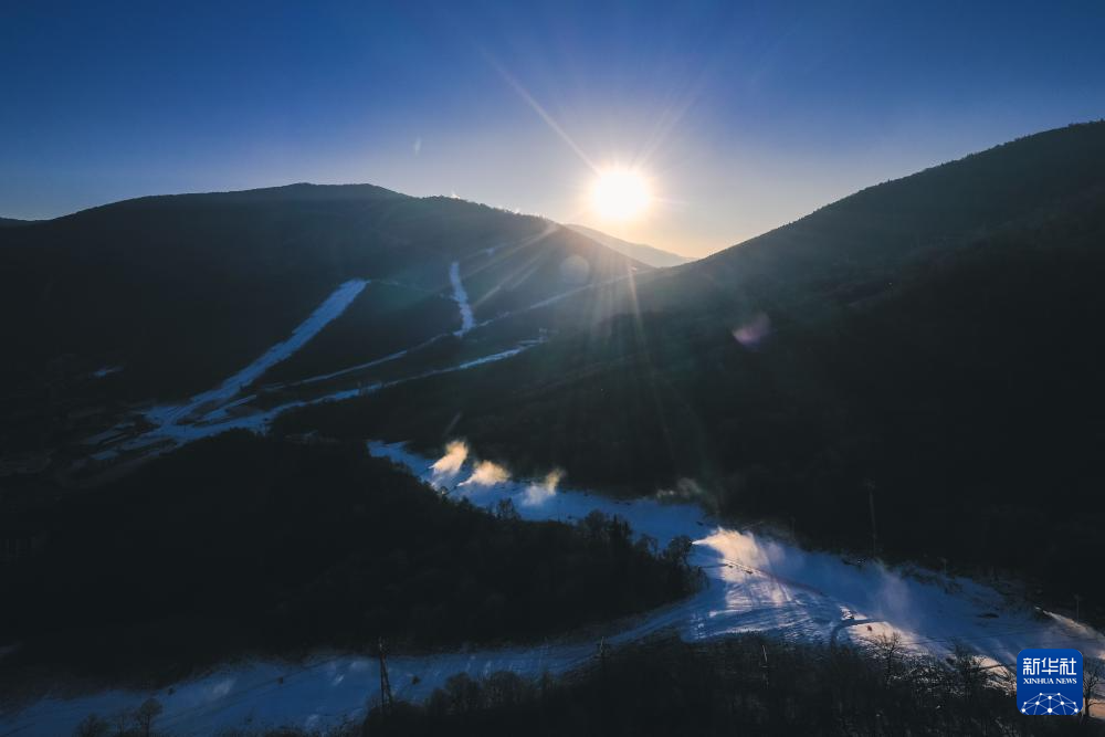 11月14日,在位于吉林市冰雪经济高质量发展试验区的北大湖滑雪度假区,造雪机进行造雪作业(无人机照片)。