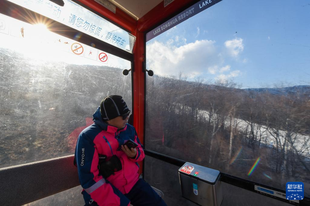 11月13日,在位于吉林省吉林市的松花湖度假区雪场,负责人吴涛乘缆车检查造雪情况。