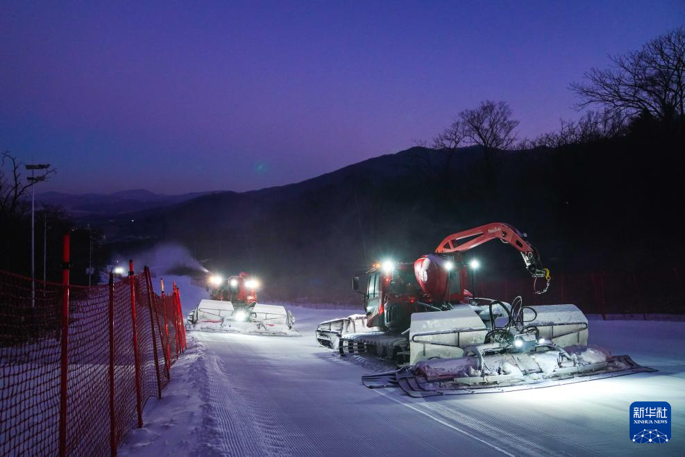 11月14日,在位于吉林市冰雪经济高质量发展试验区的北大湖滑雪度假区,压雪机在雪道上作业。