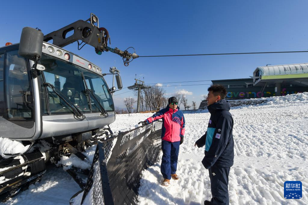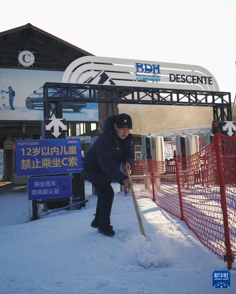 11月14日,在位于吉林市冰雪经济高质量发展试验区的北大湖滑雪度假区,工作人员平整缆车站闸机附近的雪面。