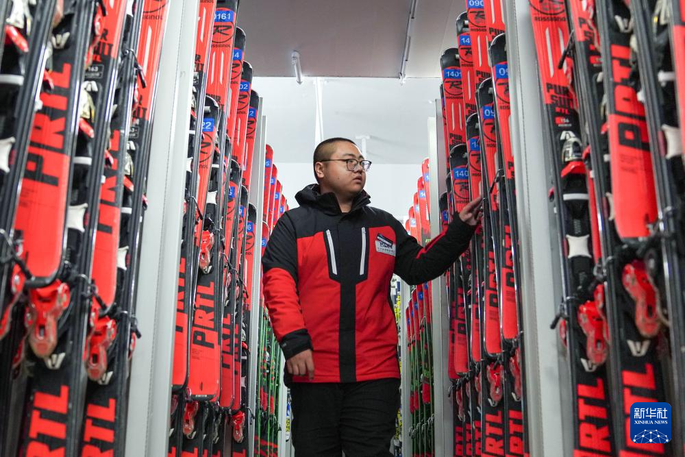11月14日,在位于吉林市冰雪经济高质量发展试验区的北大湖滑雪度假区,工作人员清点用于租赁的雪具。