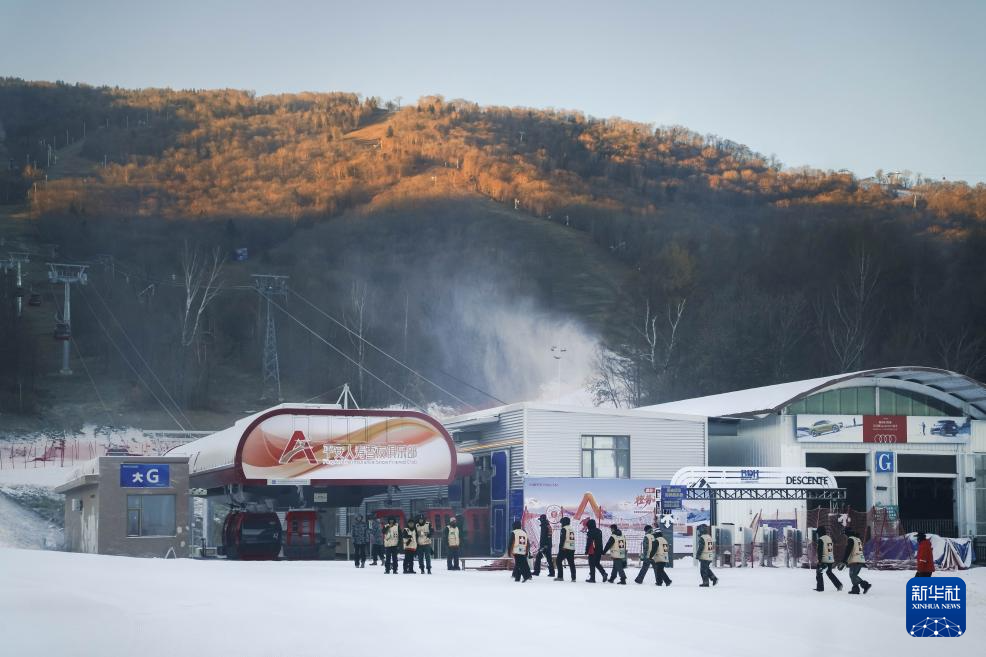 11月14日,在位于吉林市冰雪经济高质量发展试验区的北大湖滑雪度假区,工作人员集结准备进行雪道巡检。