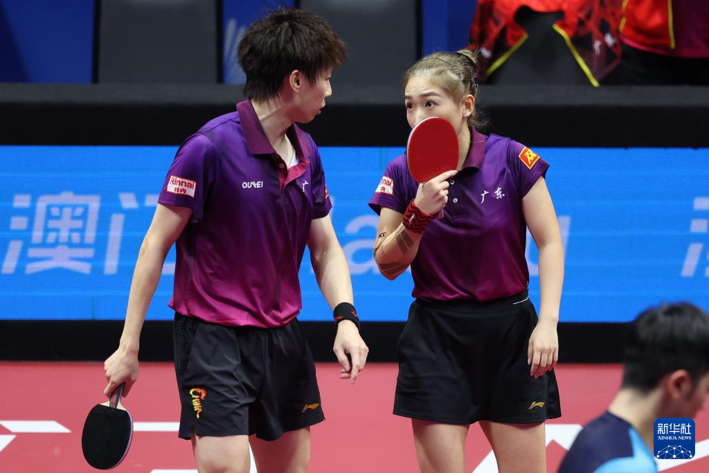 11月14日,广东队组合林高远(左)/刘诗雯在比赛中交流。