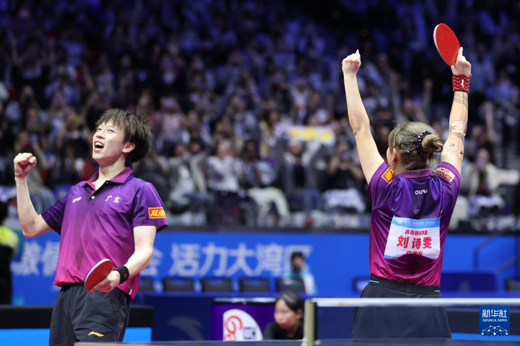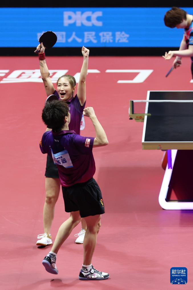 11月14日,广东队组合林高远(右)/刘诗雯在比赛后庆祝夺冠。