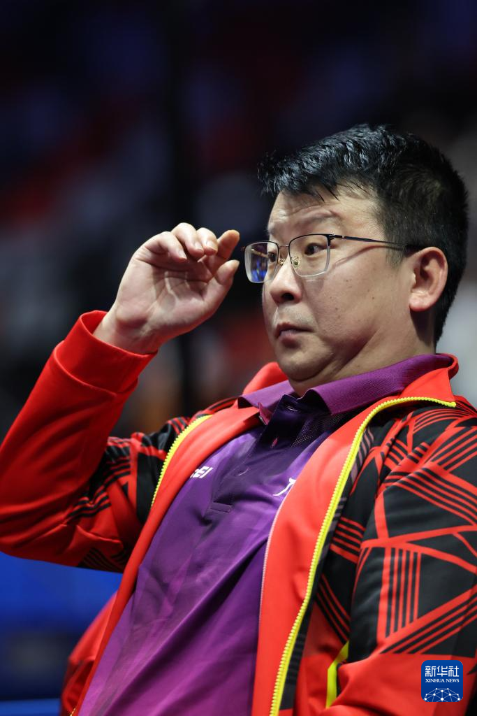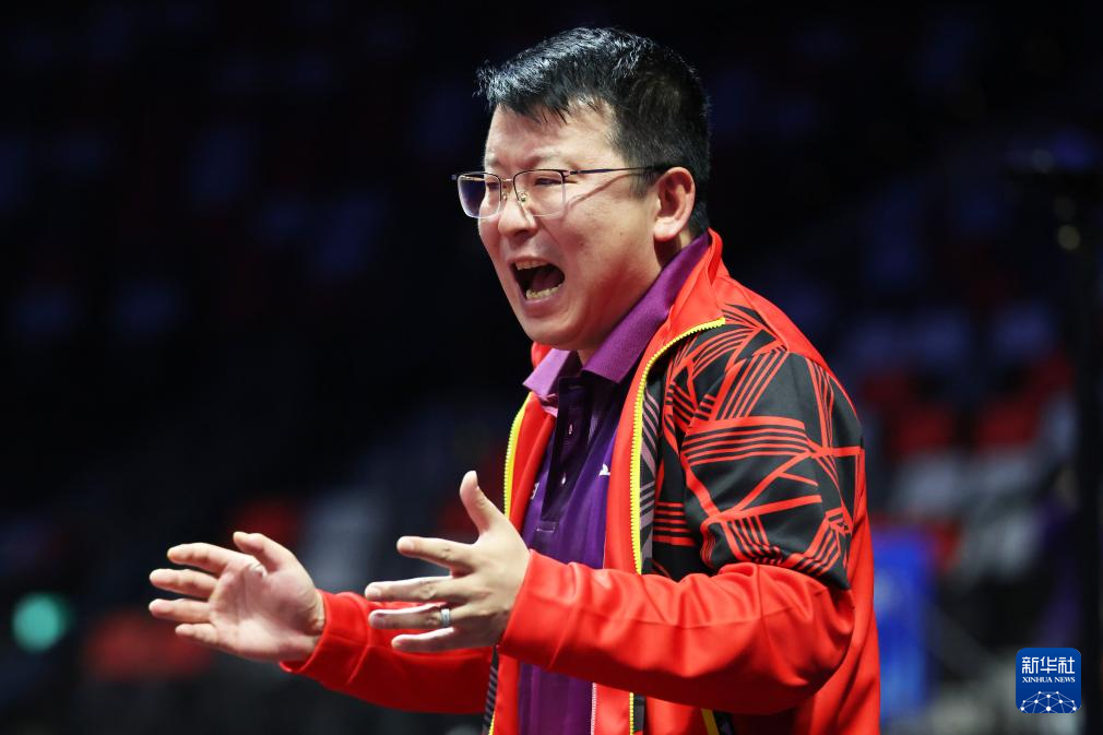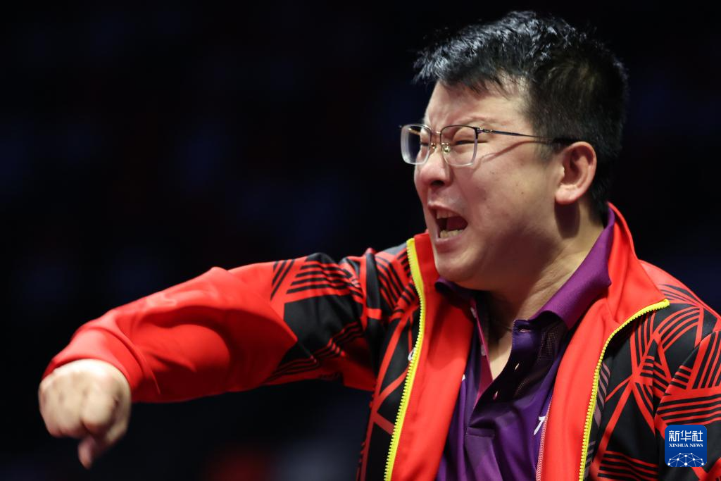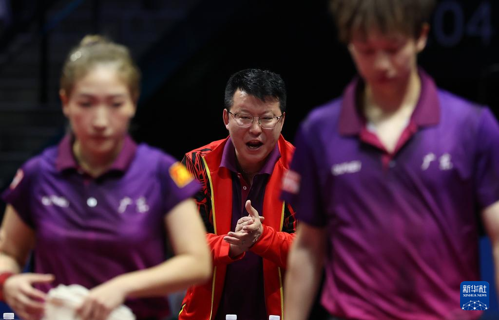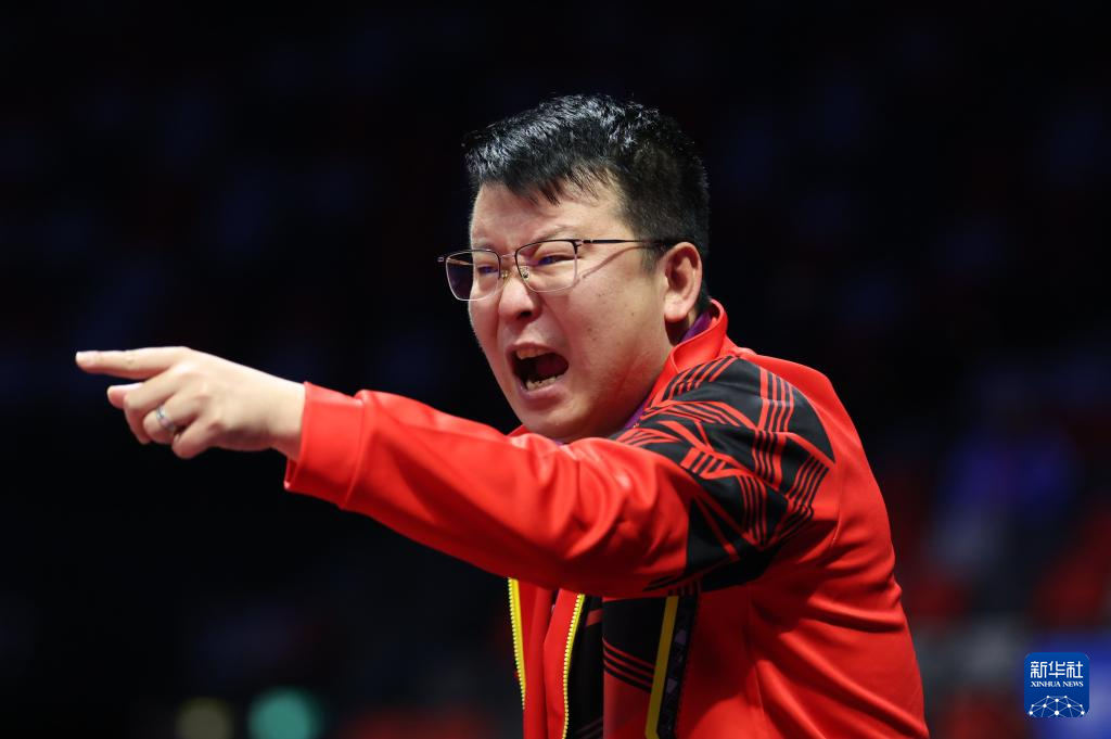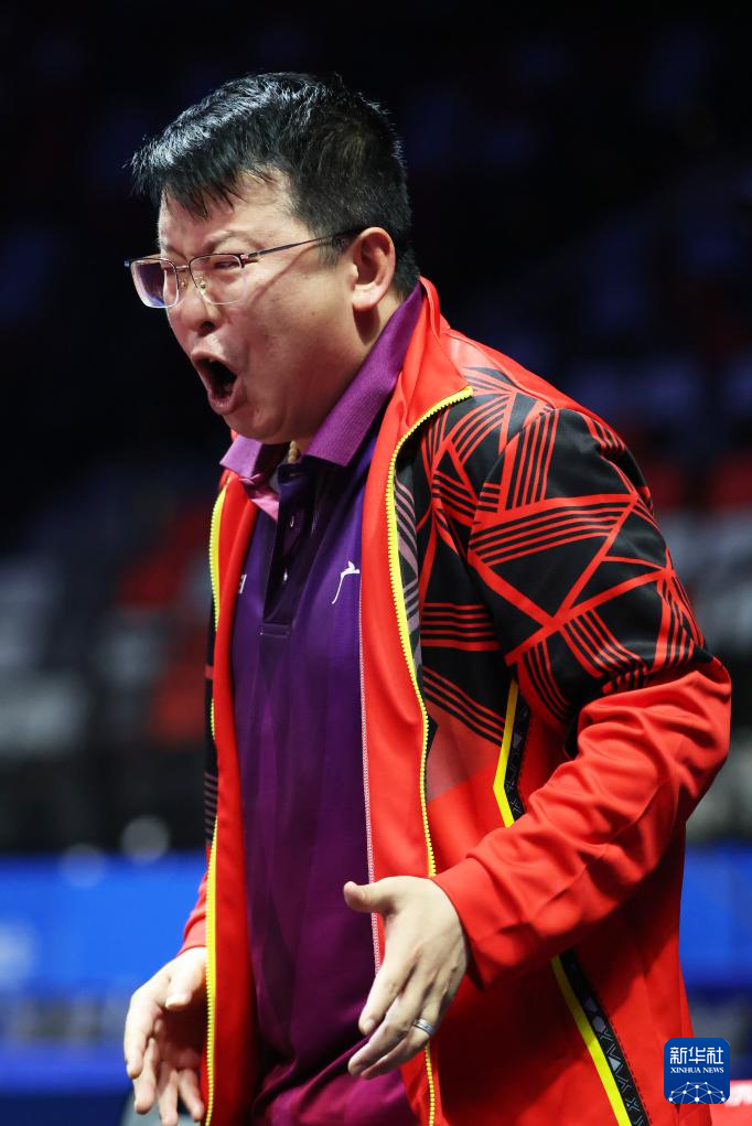 11月14日,广东队教练张超(中)在比赛间隙鼓励队员林高远(右)/刘诗雯。