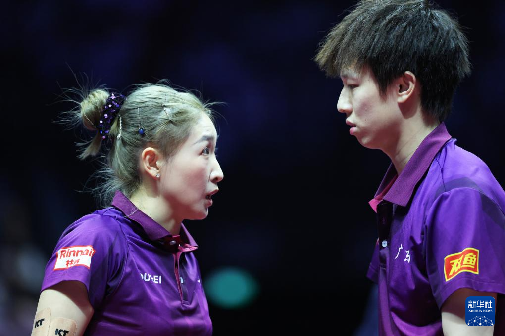 11月14日,广东队组合林高远/刘诗雯(左)在比赛中交流。