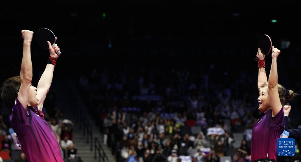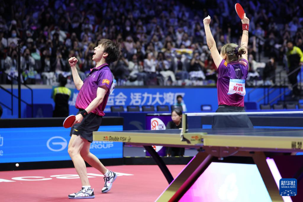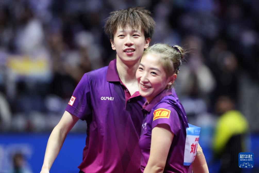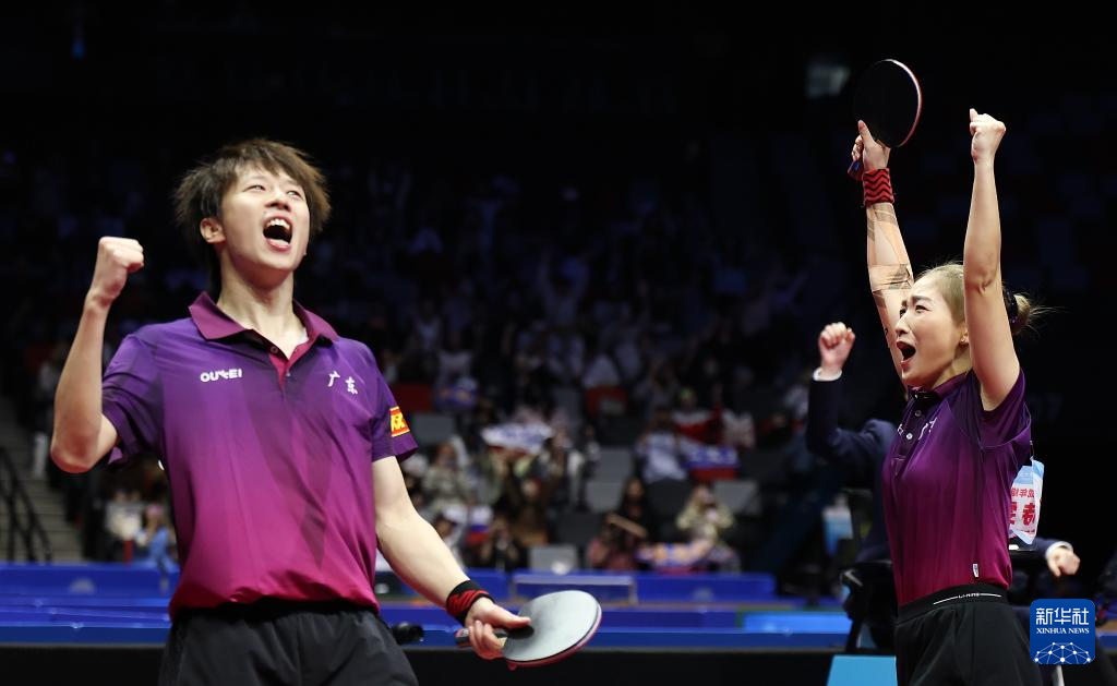 11月14日,广东队组合林高远(左)/刘诗雯庆祝夺冠。