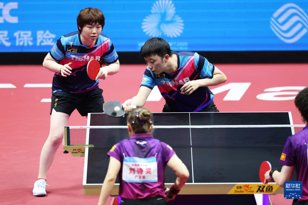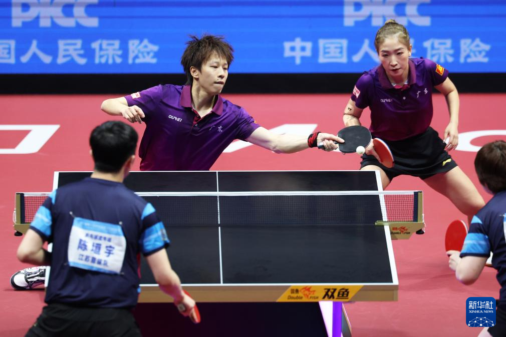 11月14日,广东队组合林高远/刘诗雯(右)和江苏队组合陈垣宇/蒯曼在比赛中。
