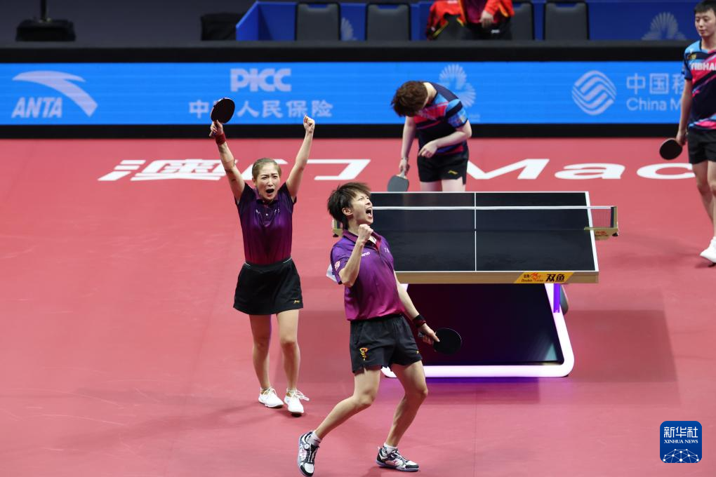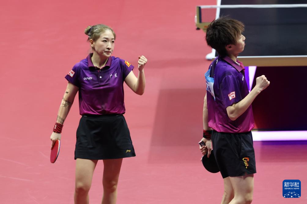 11月14日,广东队组合林高远(左)/刘诗雯在比赛中庆祝得分。