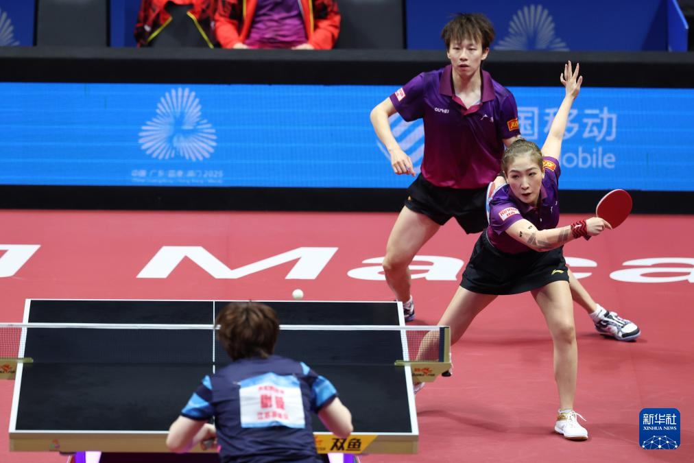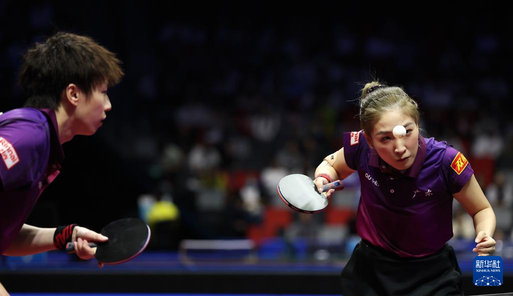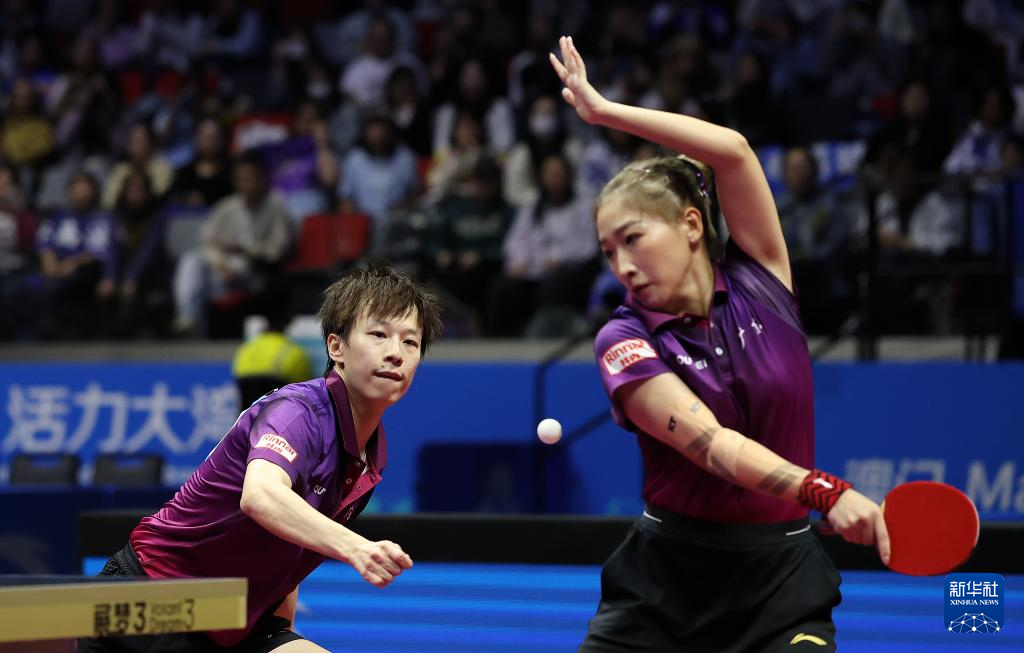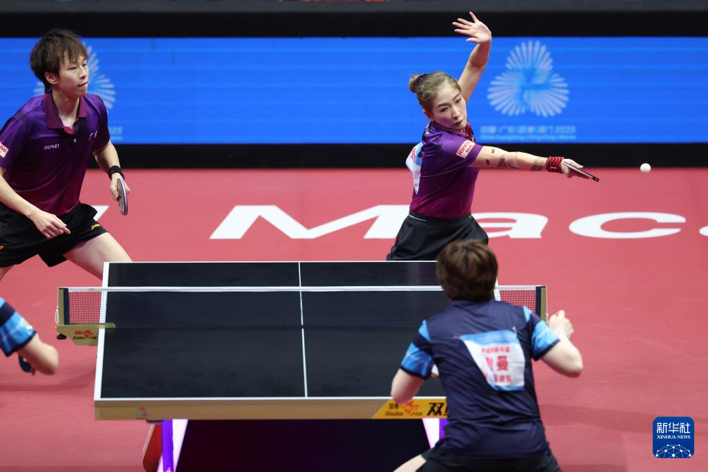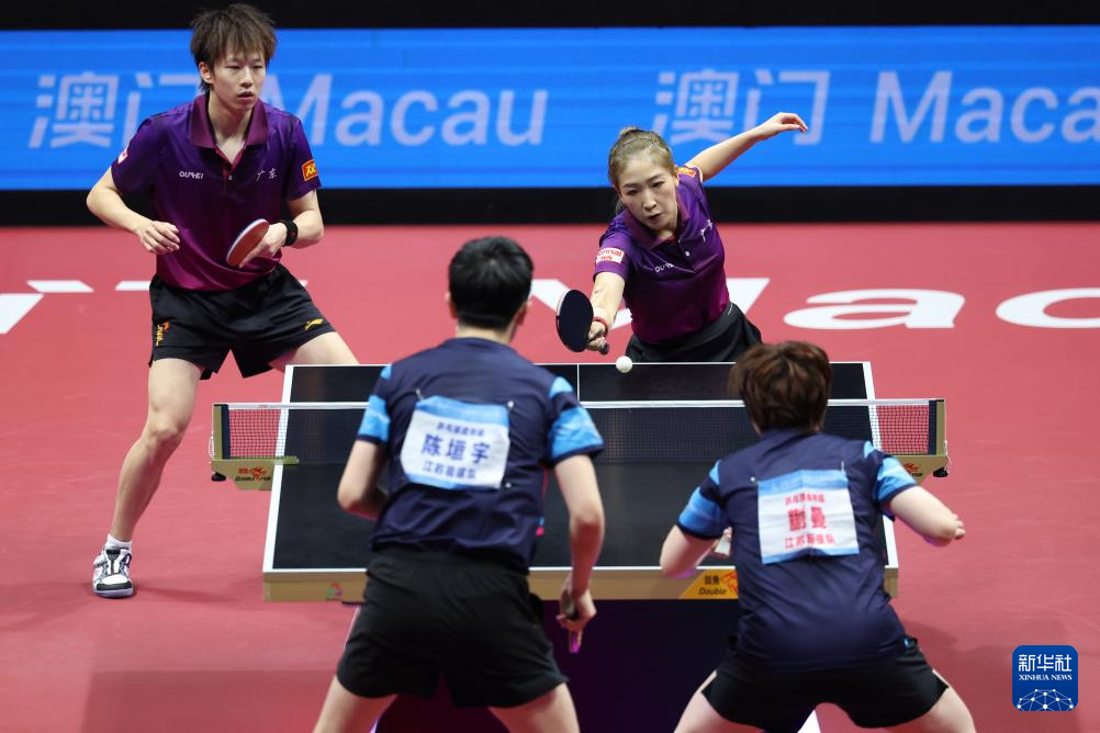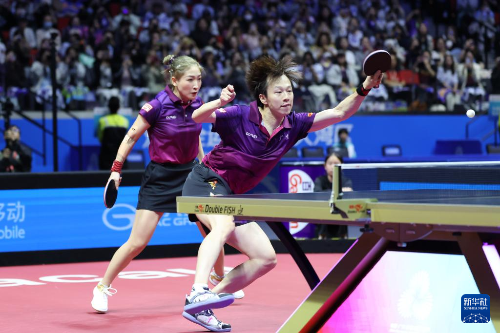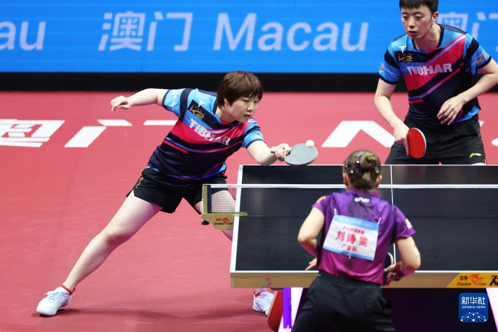11月14日,广东队组合林高远(右)/刘诗雯在比赛中回球。