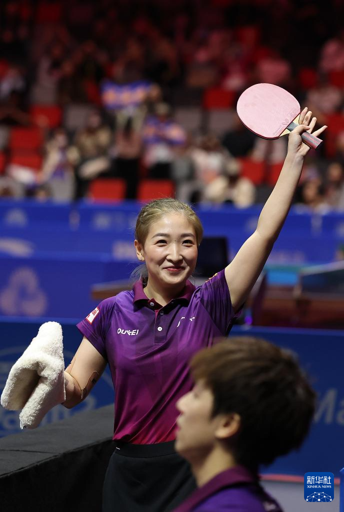 11月14日,广东队选手刘诗雯在比赛后向观众致意。
