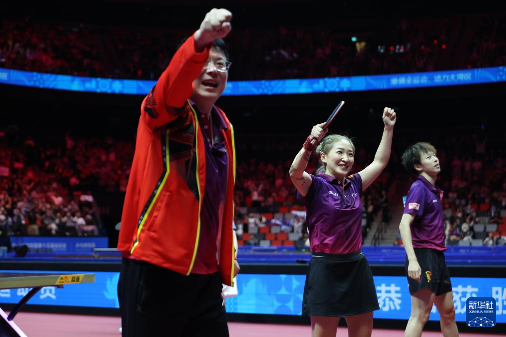 11月14日,广东队组合林高远(右)/刘诗雯(中)与教练张超在比赛后庆祝夺冠。