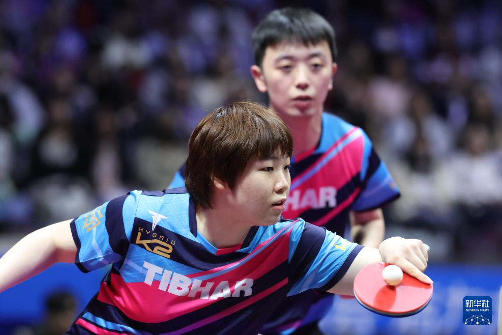11月14日,广东队组合林高远(左)/刘诗雯在比赛中回球。