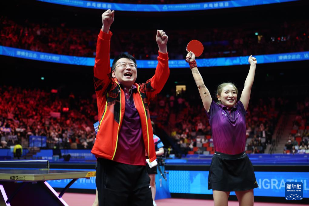 11月14日,广东队选手刘诗雯(右)与教练张超在比赛后庆祝夺冠。