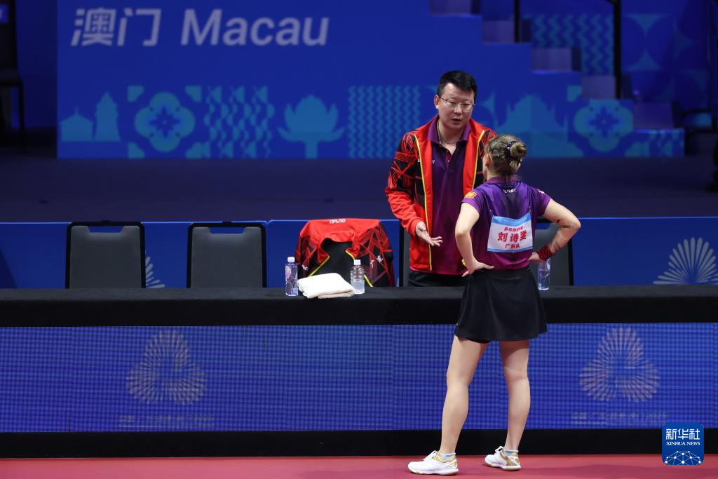11月14日,广东队选手刘诗雯(右)在比赛间隙与教练张超交流。
