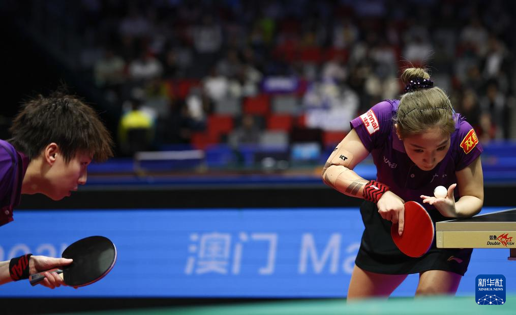 11月14日,广东队组合林高远(右)/刘诗雯在比赛中发球。