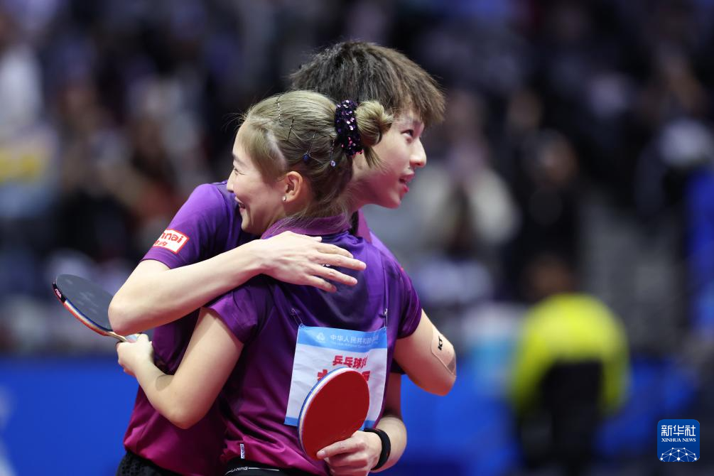 11月14日,广东队组合林高远(左)/刘诗雯在比赛后庆祝夺冠。