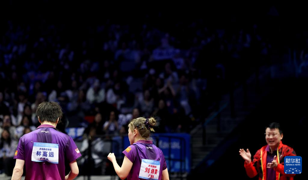 11月14日,广东队组合林高远/刘诗雯(右)庆祝夺冠。