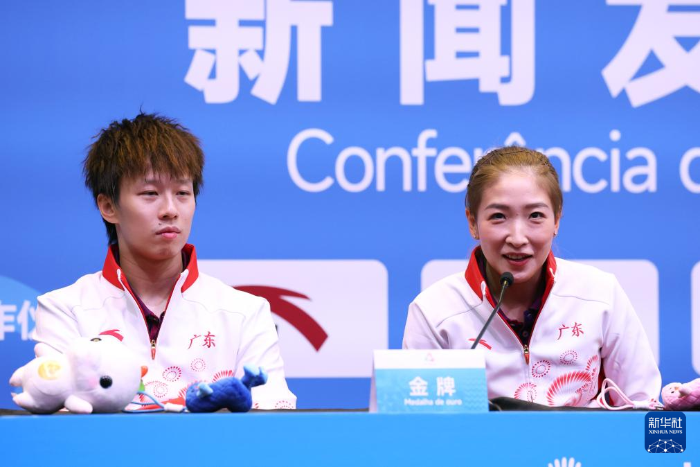 11月15日,获得冠军的广东队组合林高远(左)/刘诗雯在赛后新闻发布会上接受采访。