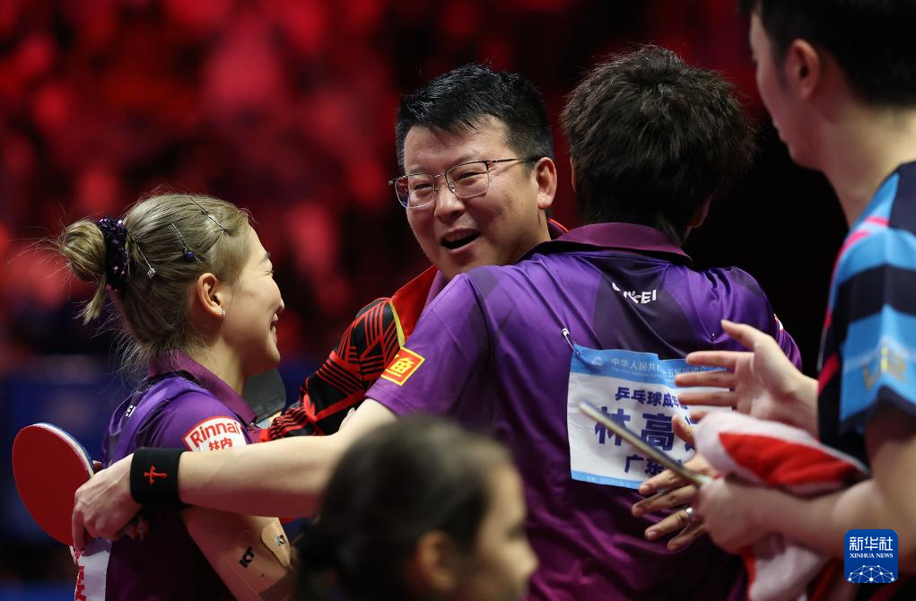 11月14日,广东队组合林高远(左三)/刘诗雯(左一)与教练张超(左二)在比赛后庆祝夺冠。