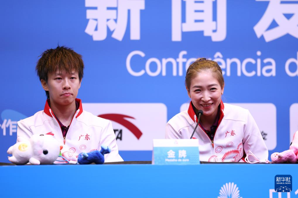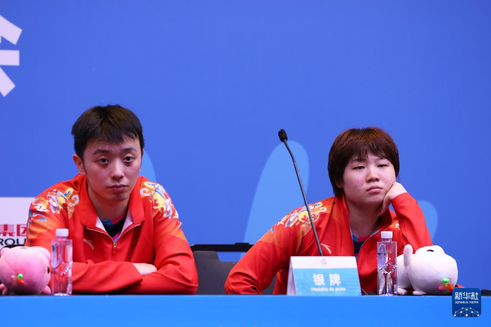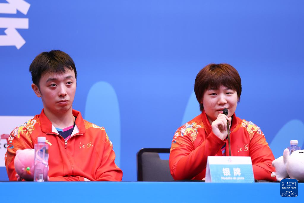 11月15日,获得亚军的江苏队组合陈垣宇(左)/蒯曼在赛后新闻发布会上接受采访。