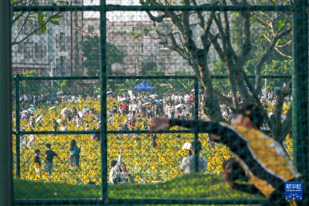 11月16日,在比赛场地旁练习的北京队球员与中山国际棒垒球中心向日葵花海和游客相映成趣。