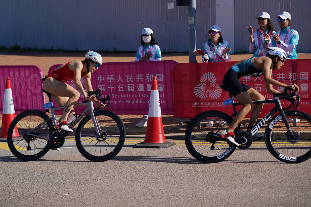 11月16日,山东队选手杨一凡(右)和香港队选手彭诗雅在自行车比赛中。新华社发(王申摄)