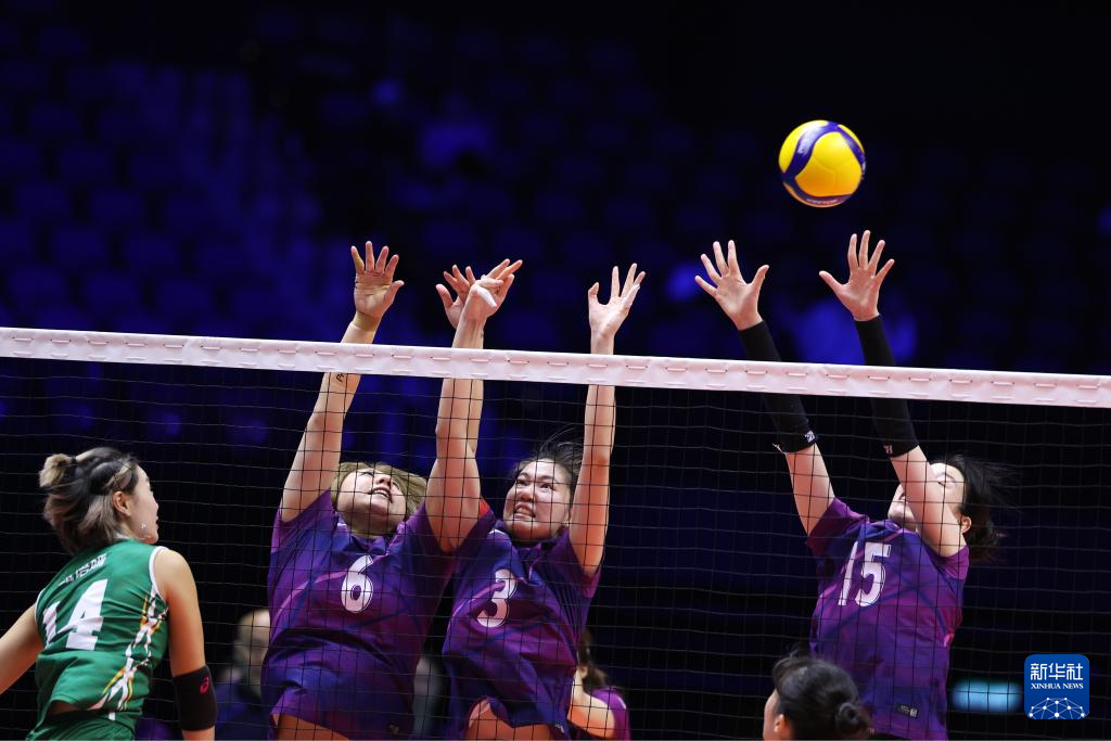 11月15日,四川队球员王晨(左二)、王思佳(左三)和袁果(右一)在比赛中拦网。